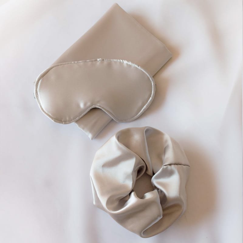 Aprovechá este combo de satén! Incluye 1 funda , 1 antifaz y 1 scrunchie gris silver.