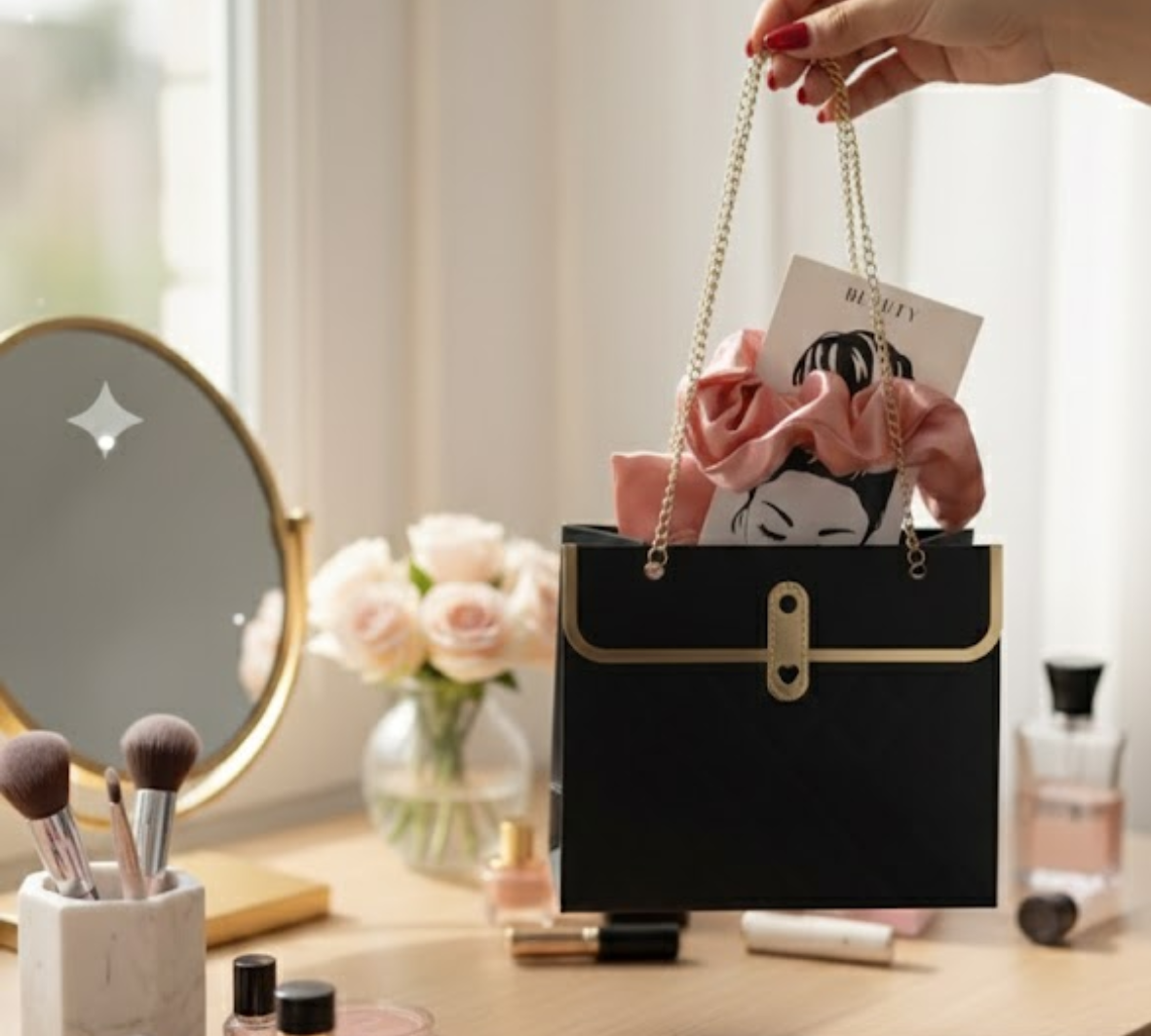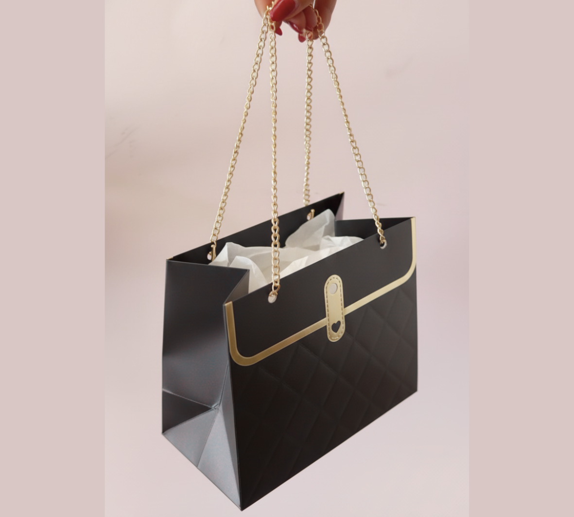 Presentamos nuestra cartera de packaging diseñada exclusivamente para proteger y lucir tus productos de satén. Su estructura firme y diseño minimalista la convierten en la pieza ideal para nuestro Set Premium. Detalle con cadena y color negro